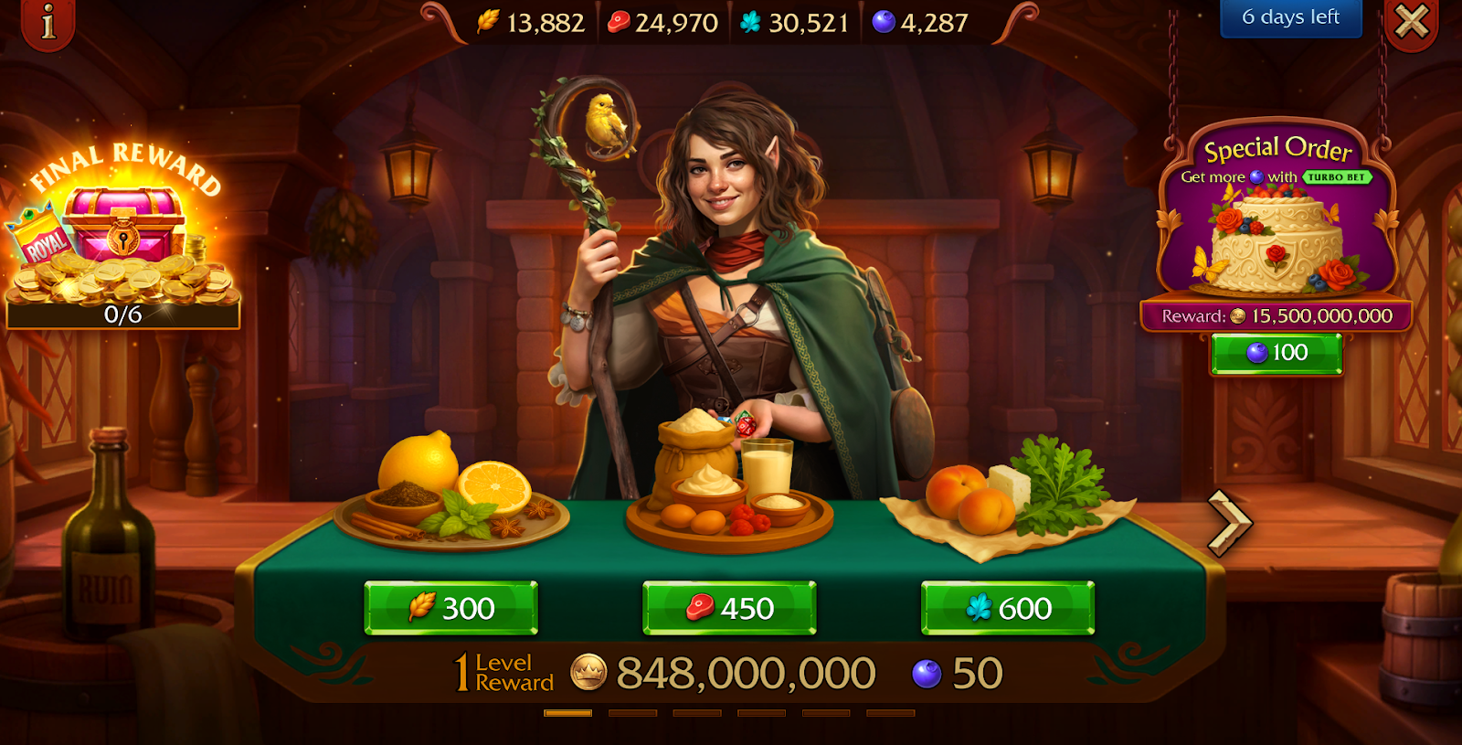 Cook dishes – Every tavern guest has 3 orders per level. Use the corresponding currency to prepare each dish and delight your guests!