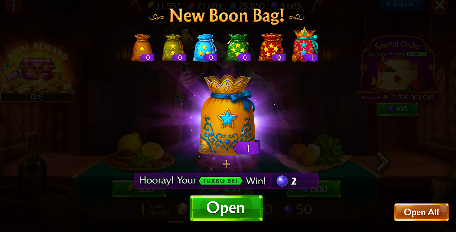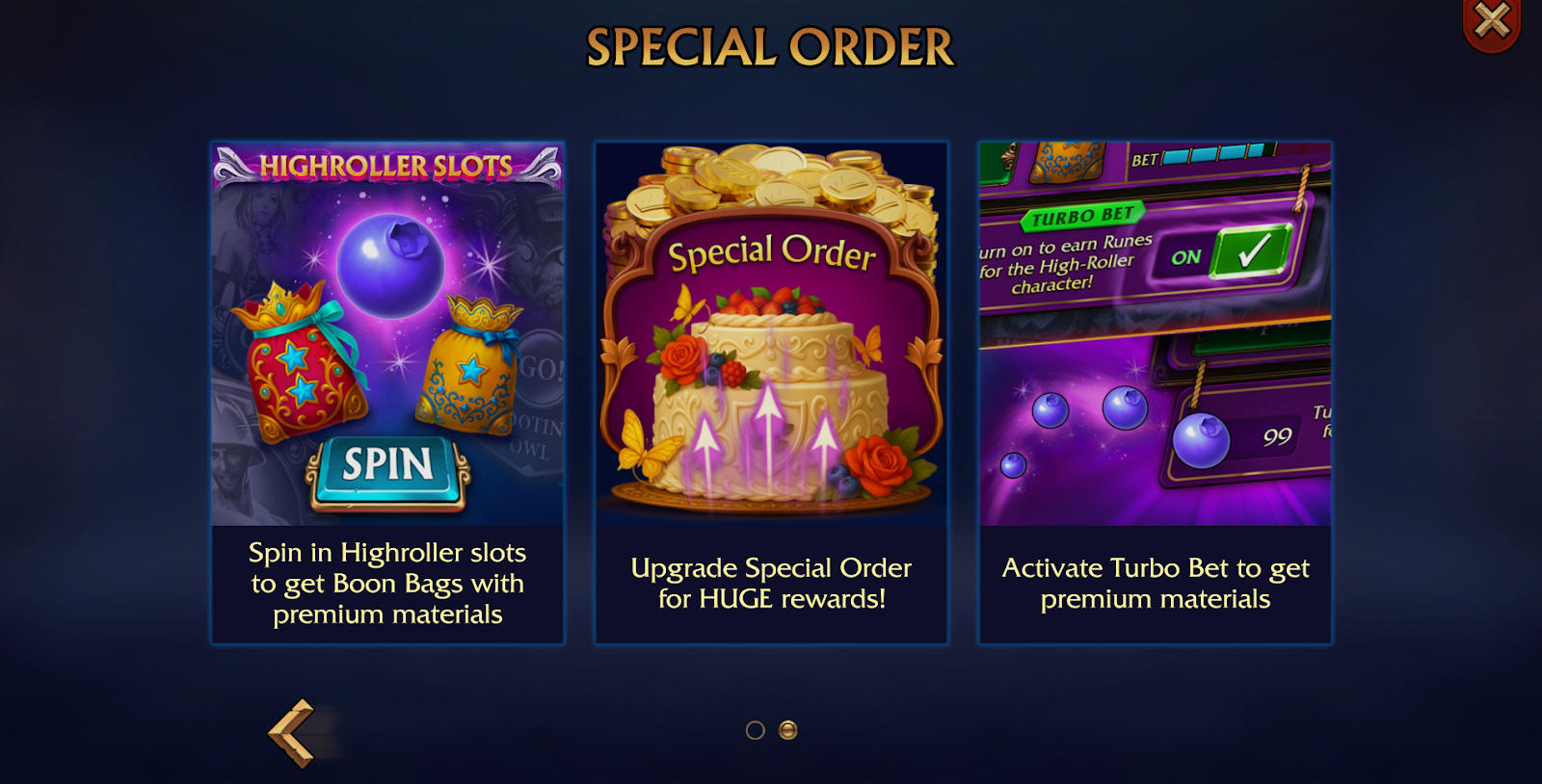 VIP orders are special and separate from the main levels. You can either spin in Highroller slots to get Boon Bags containing premium materials, or play with Turbo Bet activated.