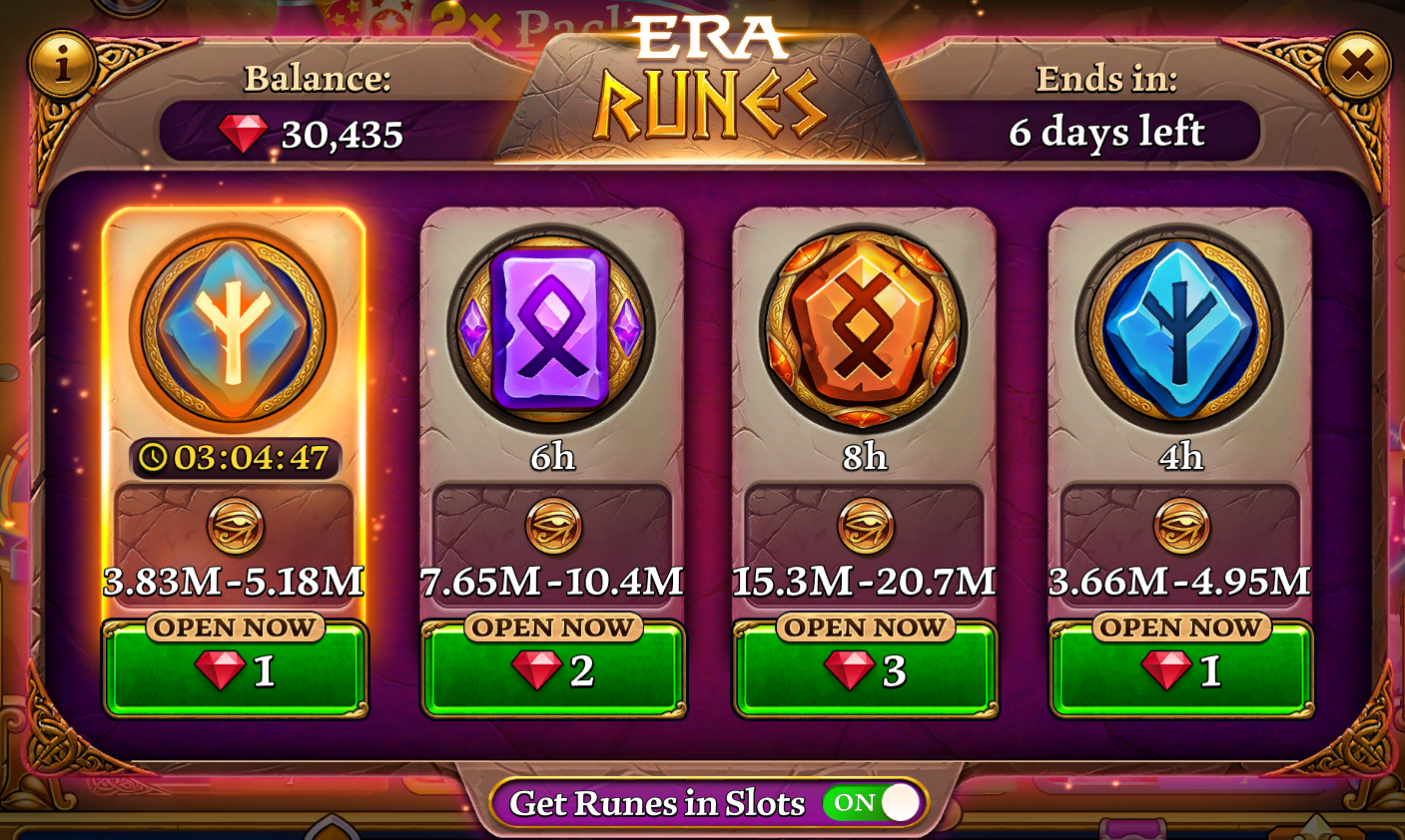 Each Rune unlocks after a set time and has its own level, look, and prize size, depending on your win.