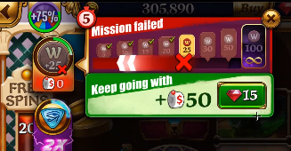 Si pierdes la misión, tu progreso retrocede al principio de la escalera, pero todos los Wild Points que hayas ganado se quedan contigo. ¡Así que incluso perder la misión puede ser parte de tus tácticas para obtener más Wild Points!